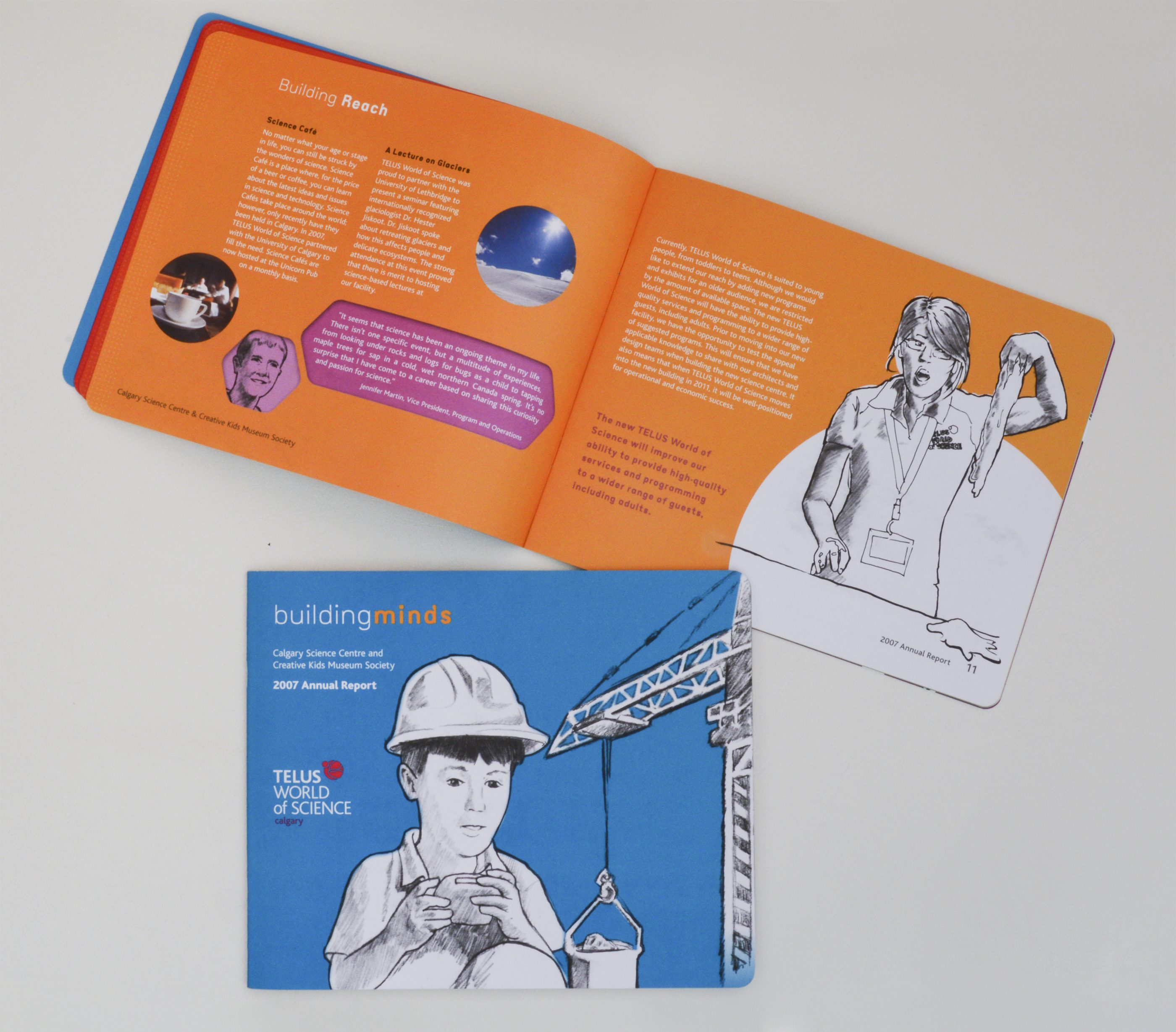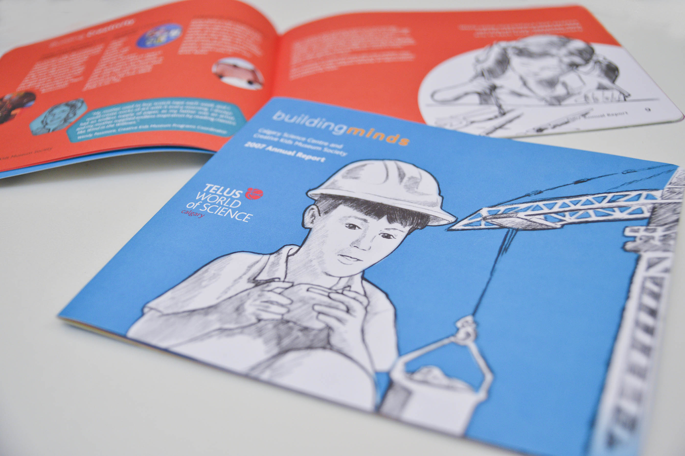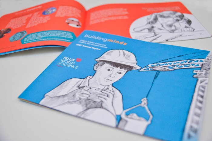 This was the first annual report and the theme of the report was “Building Minds”. The report was published at the beginning of the formal development phase leading up to the opening of Calgary’s new science centre on October 29, 2011, TELUS Spark.