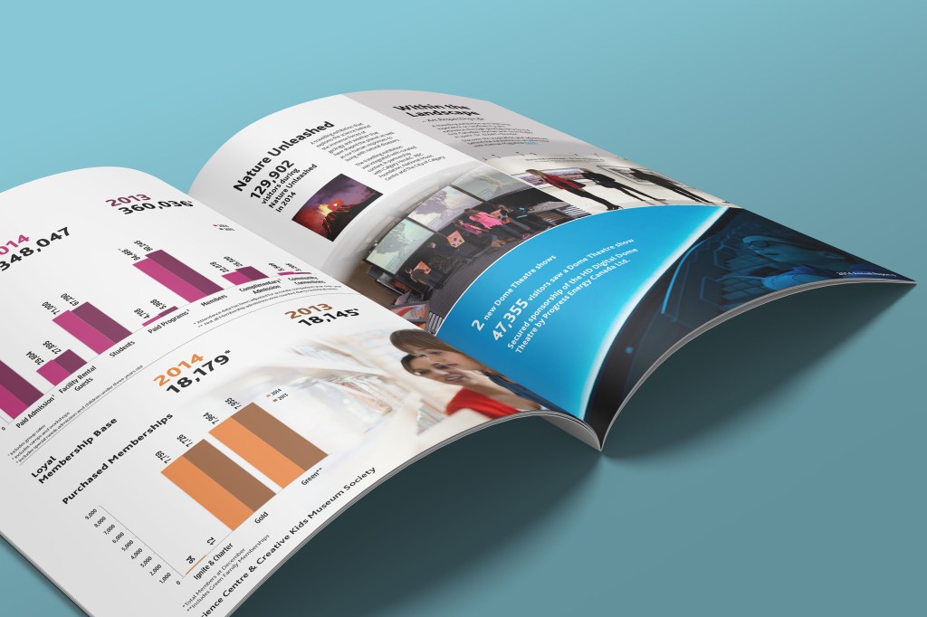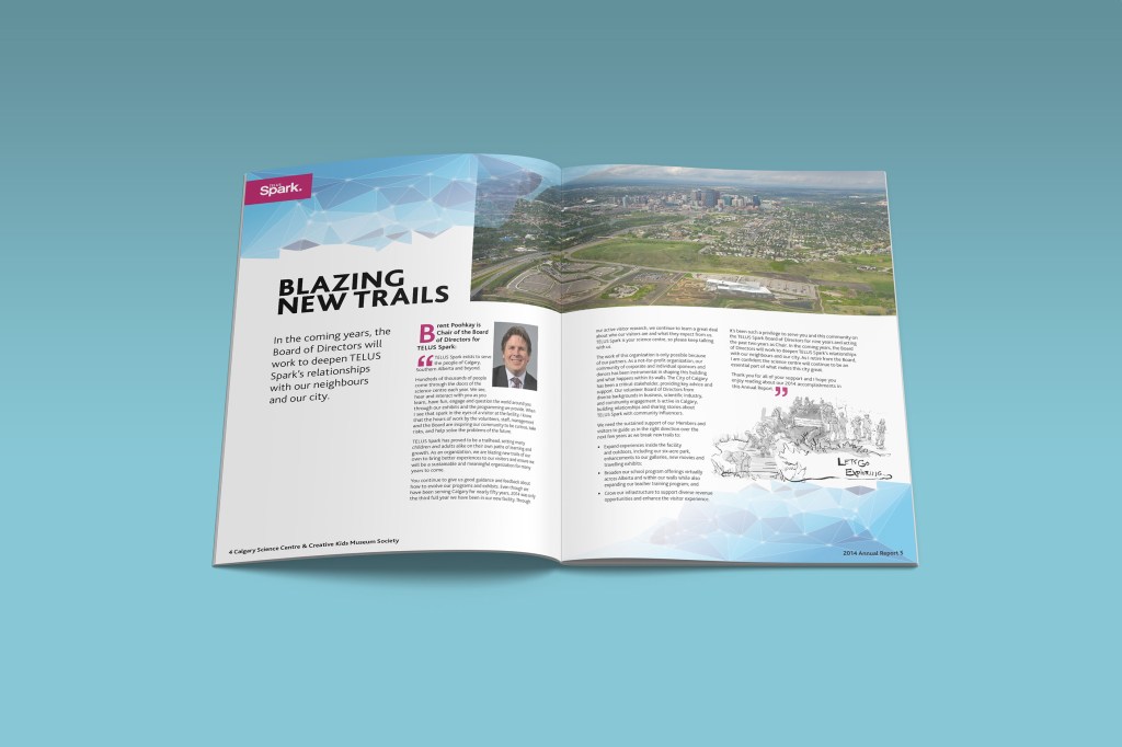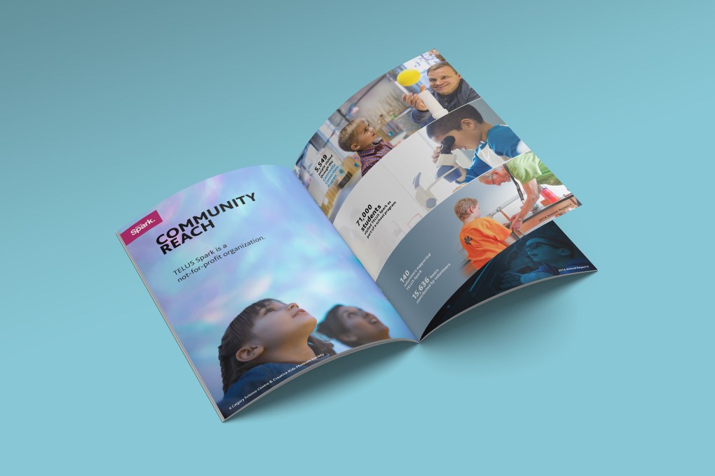 The seventh annual report I designed in the nine years I was at TELUS Spark was built around the the theme of “Making Connections” and under that umbrella spoke about the organization’s core values: collaboration, commitment, courage, and curiosity.
