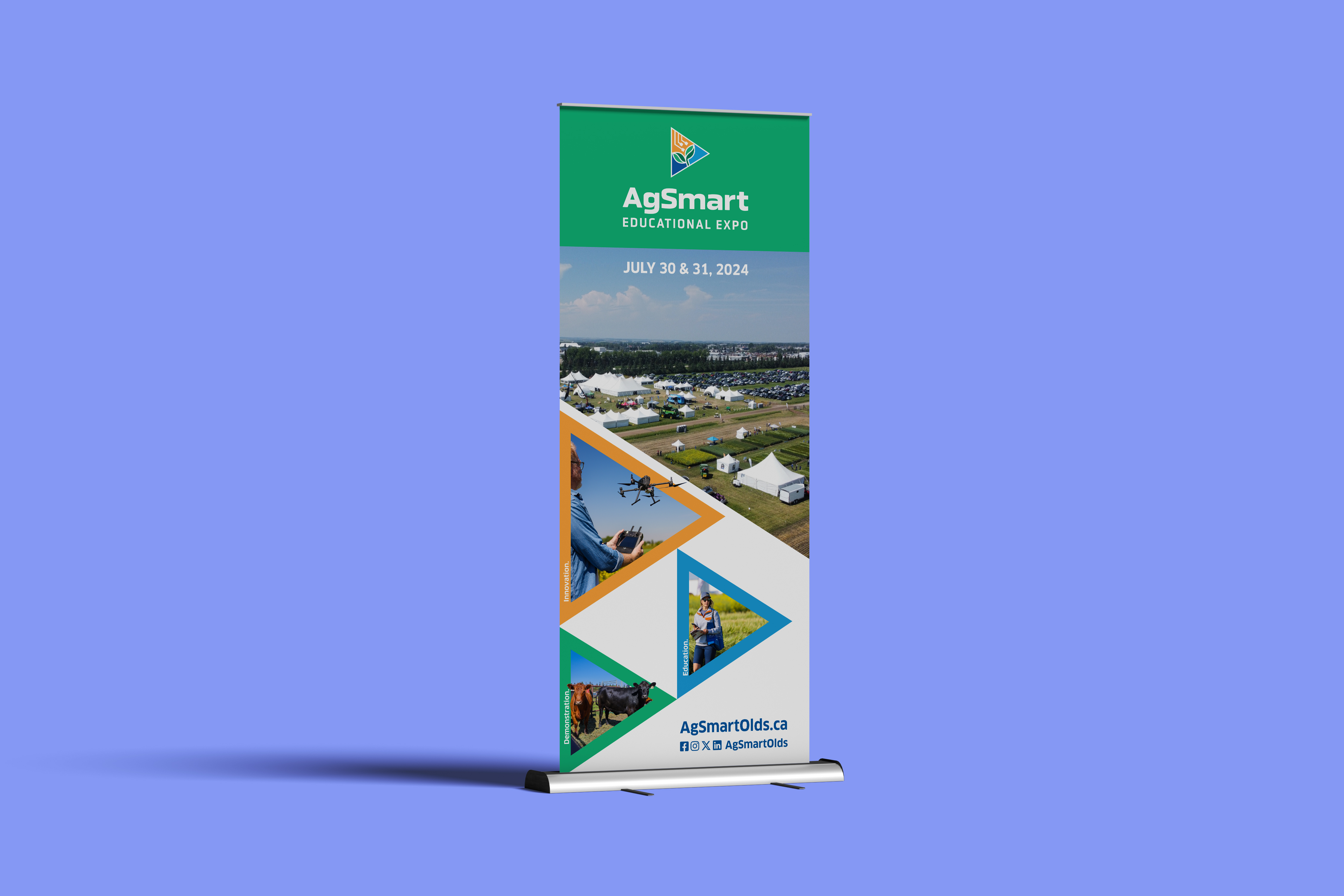 AgSmart, Olds College’s Ag Tech Educational Expo will stage the 5th anniversary edition on July 30 & 31 2024. I was given the assignment of creating a brand that would be clearly part of the Olds College family. I focused on the hexagon element within the logo, and broke it down further to an equilateral triangle. Using this basic geometry, along with the Olds College logo font and brand colors, I created a logo that combined agriculture and technology, framed in a universally recognized symbol for play, a right facing triangle. The triangle evokes forward progress and digital multimedia technology. The lines evoke circuits, and also appears to cascade like rain or irrigation. The 3 main background colors in the triangle symbolize sun, water, and air.