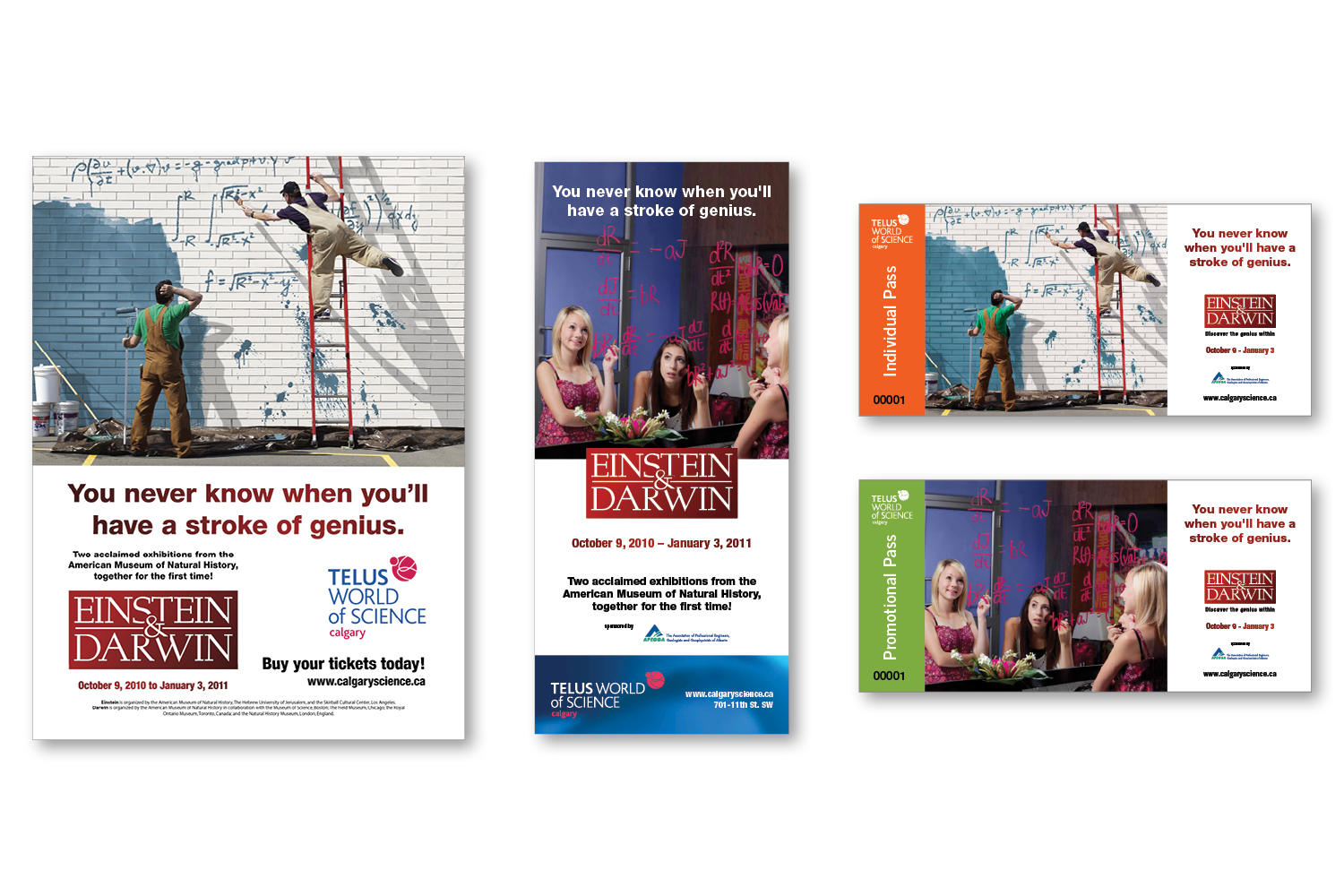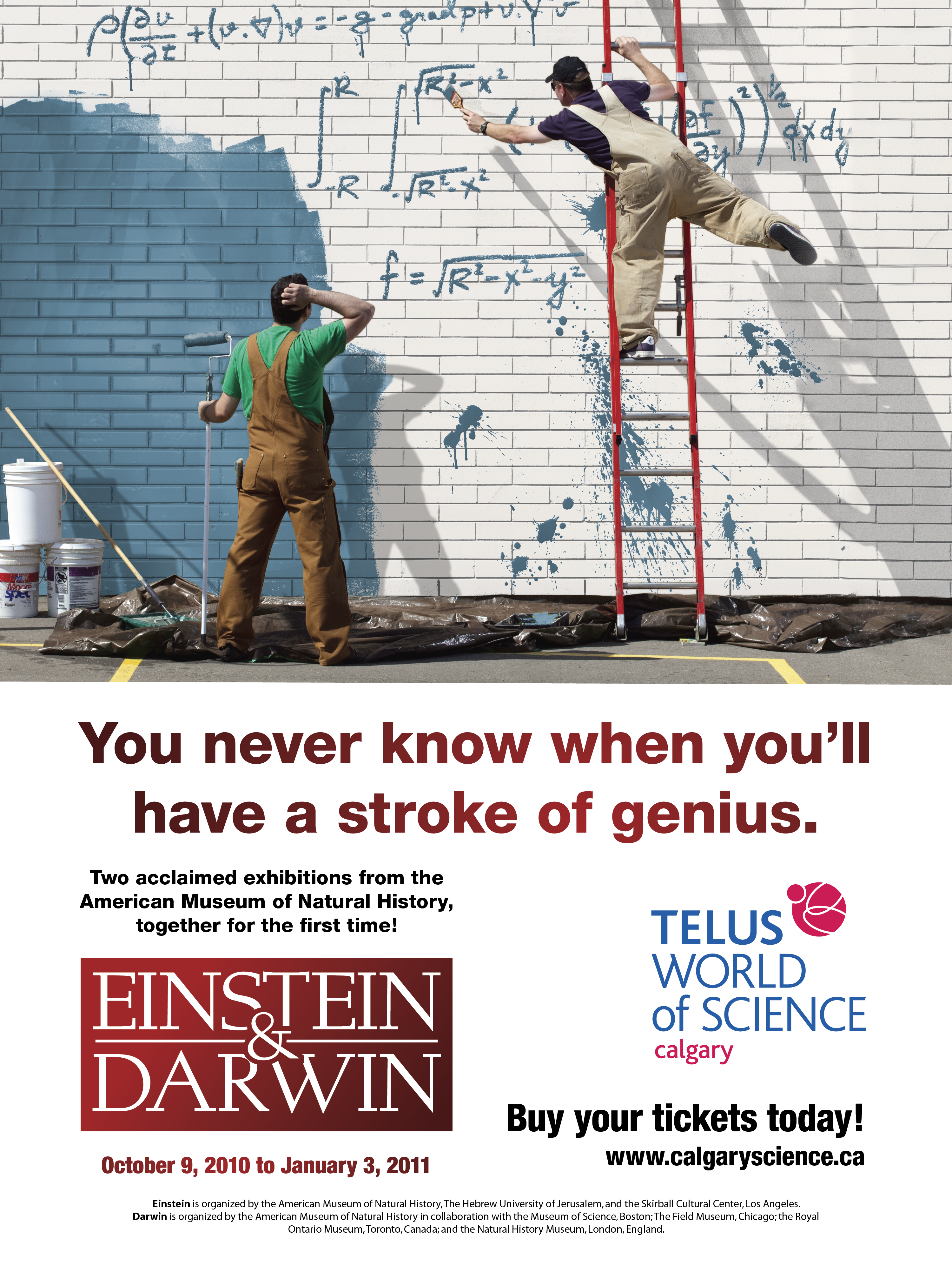 The Einstein & Darwin was the second blockbuster exhibition in a three part series staged by TELUS World of Science – Calgary in 2011 to close it’s time at the original building, before being reborn as TELUS Spark. I conceived a marketing campaign that illustrated humorous “Eureka” moments.