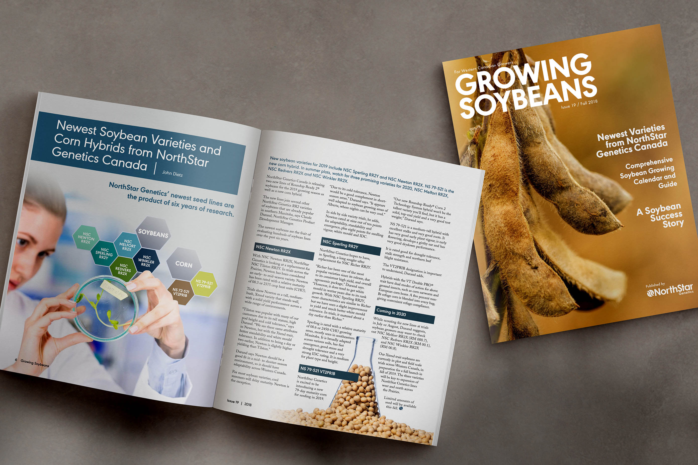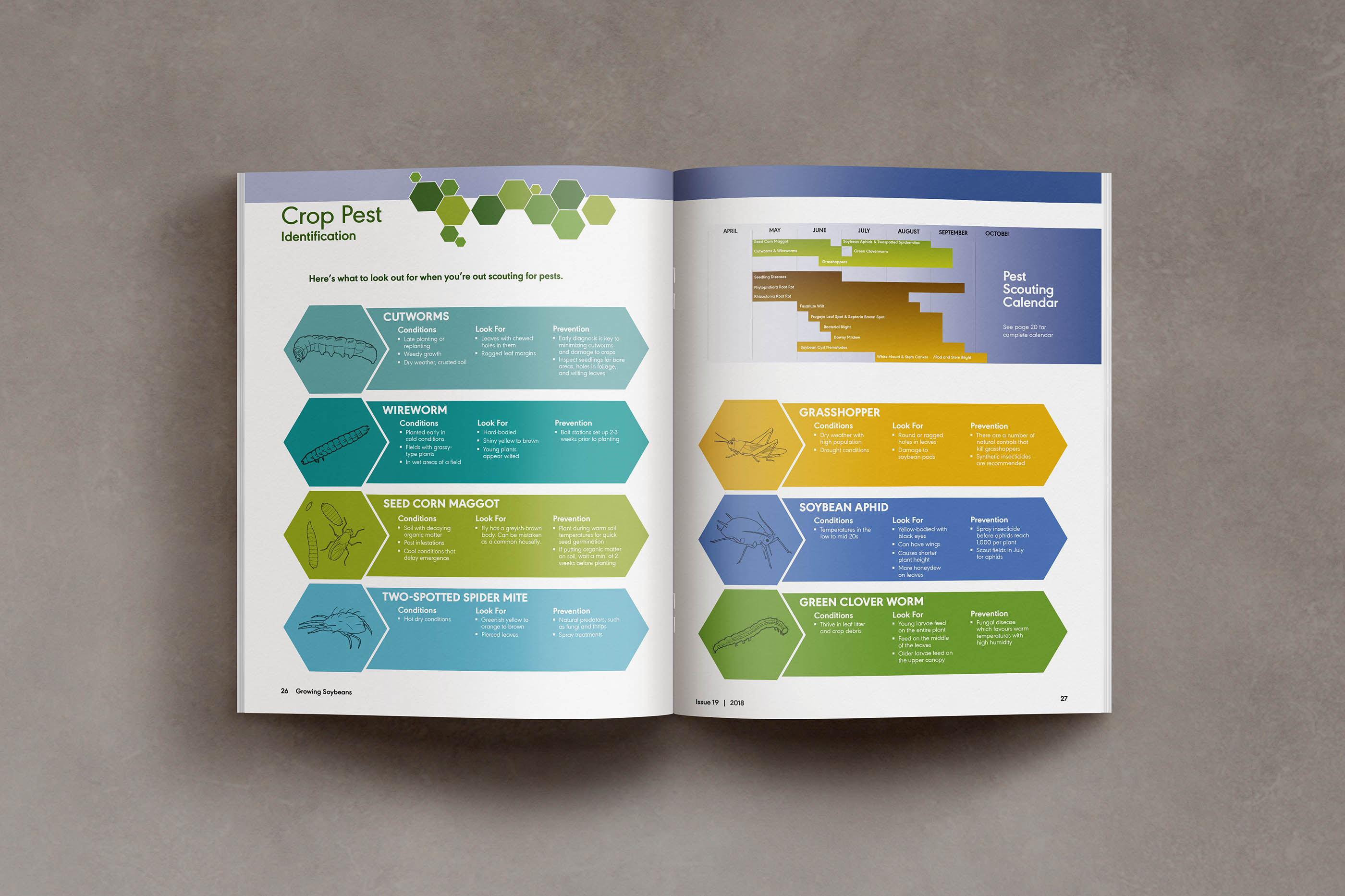 Growing Soybeans Magazine is an annual publication of NorthStar Genetics Canada. For 2018 I updated the overall look and feel. I designed a new layout a look and feel for the magazine as well as create original illustrations and layout of a four page crop pest identification guide.