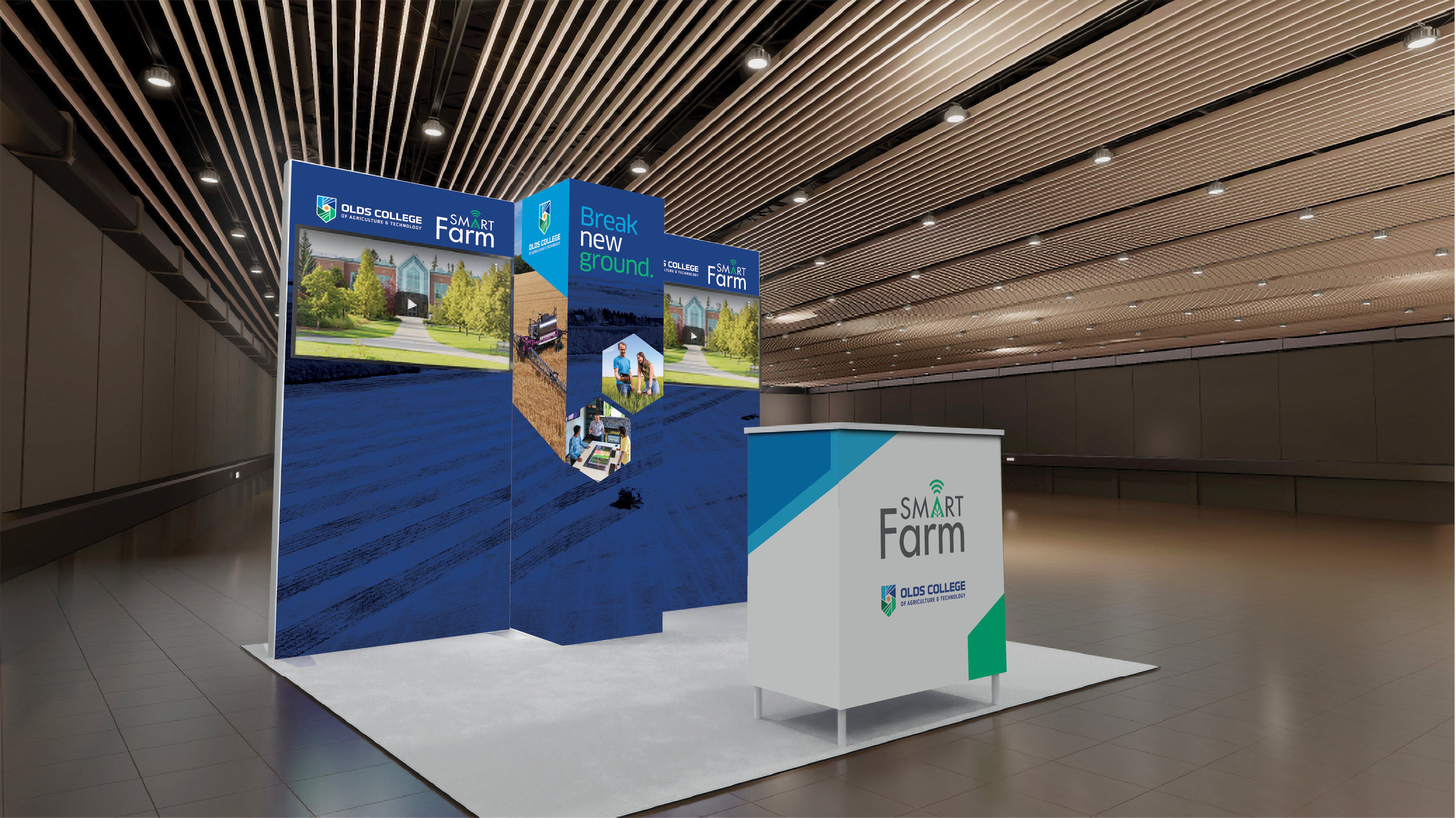 I designed this trade show booth to be on-brand and technology-focused with two 50″ TVs and the use of photos showcasing the use of smart farm technology such as sensors, IoT and data to track. monitor and optimize farming output.